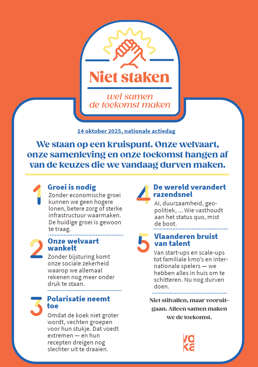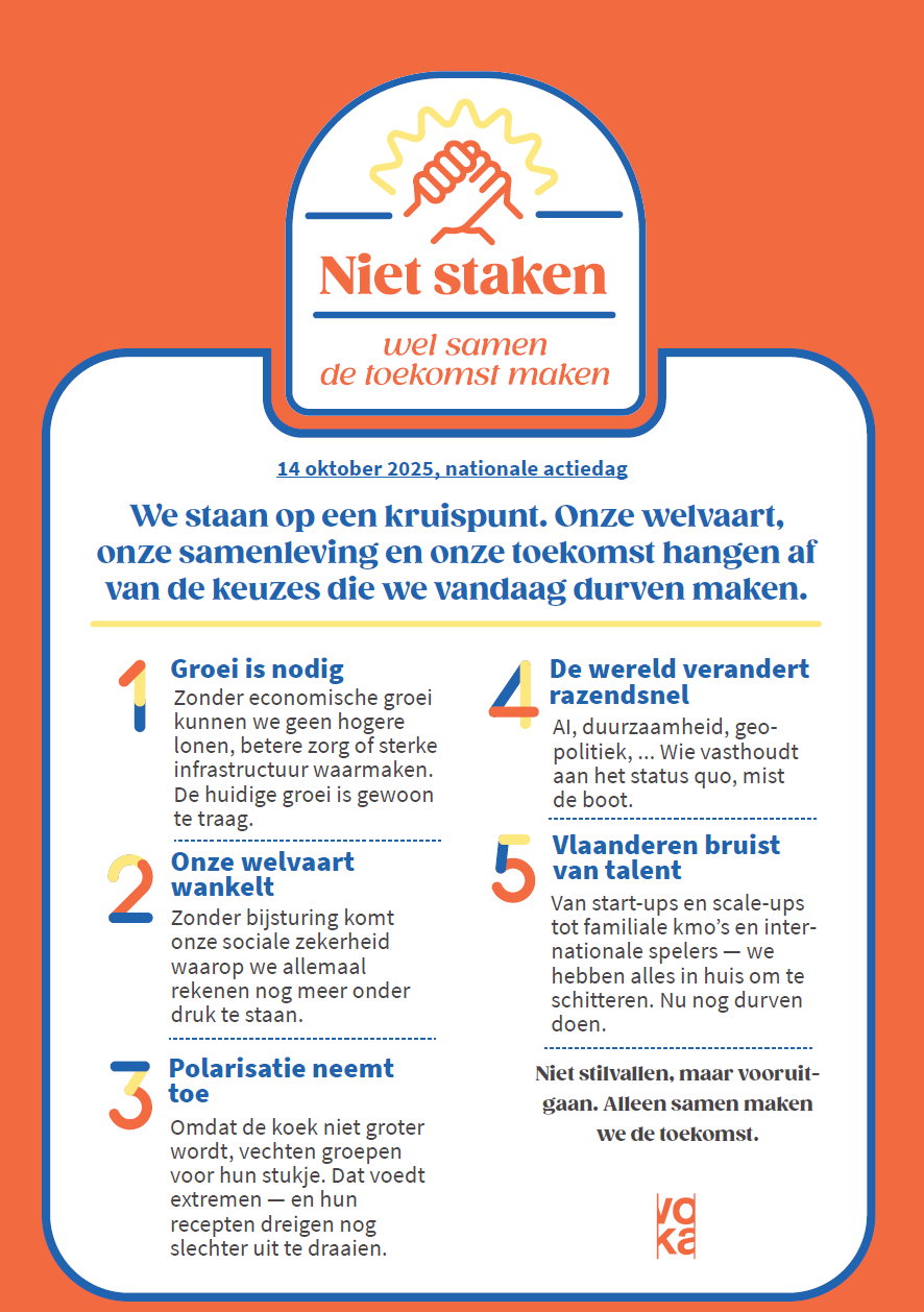 “Zonder economische groei kunnen we geen betere zorg of sterke infrastructuur waarmaken. Zonder de hervormingen waartegen vandaag wordt geprotesteerd, komt onze sociale zekerheid nog meer onder druk te staan. Nochtans hebben we in Vlaanderen met zijn vele startups, scale-ups, familiale kmo’s en internationale spelers alles in huis om te schitteren. Laten we dat ook doen. Laten we samen de toekomst maken. Laten we stoppen met ons land en onze economie te gijzelen. In het belang van ons allemaal.” Kris Claes, gedelegeerd bestuurder Voka-KvK Vlaams-Brabant